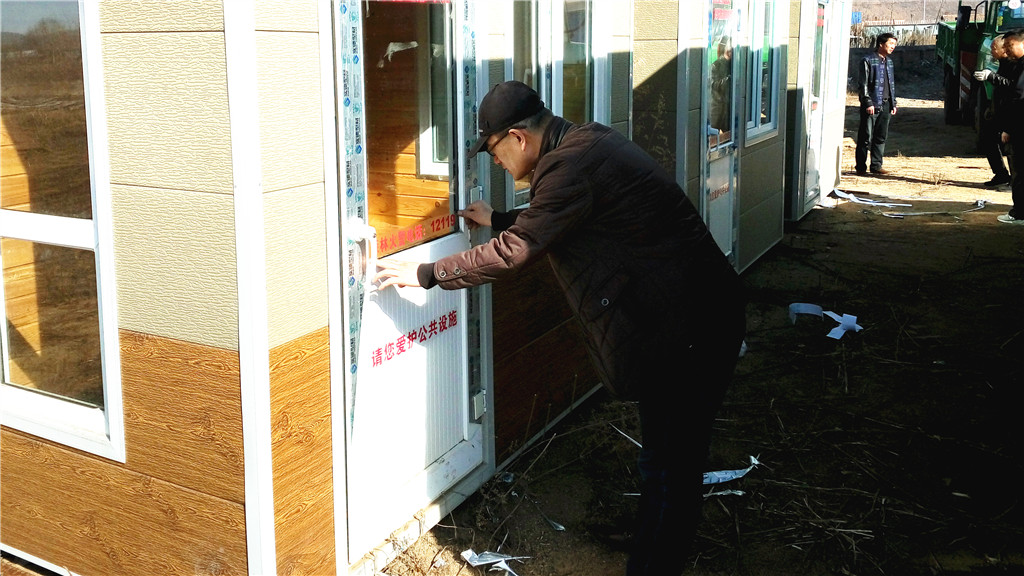 4月9日,吉文林業局防火辦為臨時防火檢查站輸送標準化板房。圖為工作人員正在為標準板房粘貼檢查標志。(司新文)