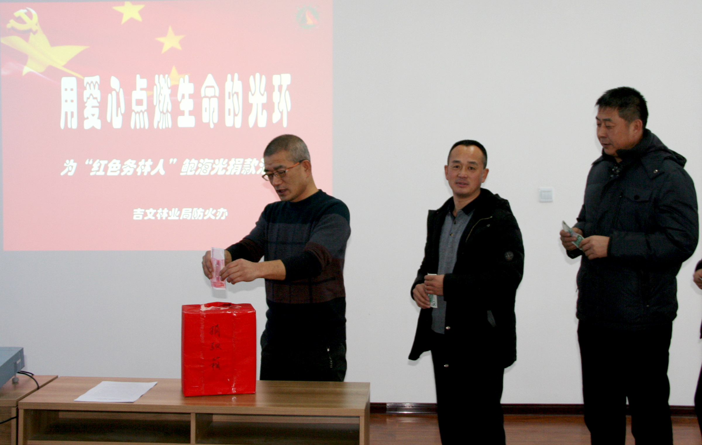 12月28日,吉文林業局防火辦黨總支舉行了主題為“用愛心點燃生命的光環——為紅色務林人鮑海光捐款儀式”。吉文林業局防火辦黨員、職工,積極參加本此活動,奉獻自己的愛心。 (劉志偉)