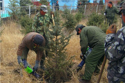 5月5日,干部職工正在用電搞挖掘樟子松樹苗。