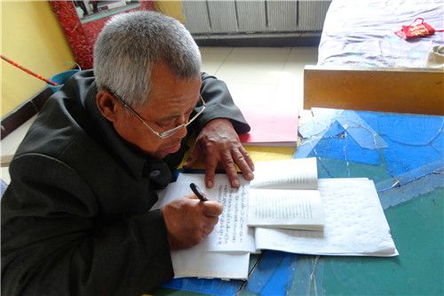 5月31日,近60歲的老黨員于冠慶正在認真抄寫黨章。