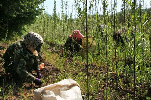 6月20日,綽爾林業局中心苗圃女工正在為竹柳除草。