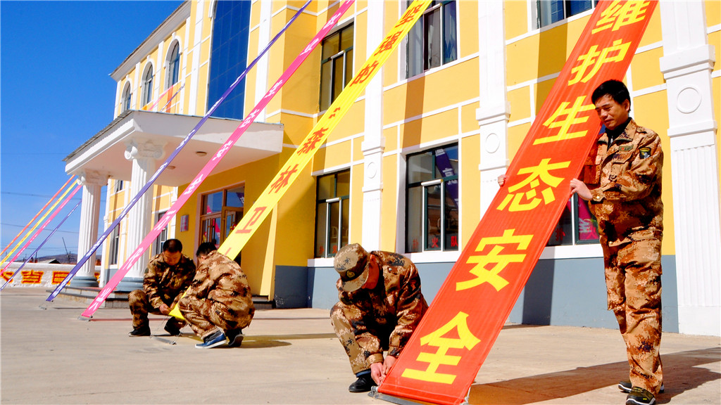 4月16日,庫都爾林業局防火辦在辦公樓前懸掛生態保護建設、森林防火等內容的宣傳條幅,全力營造春防濃厚氛圍。(陳曉琳 郭春強)