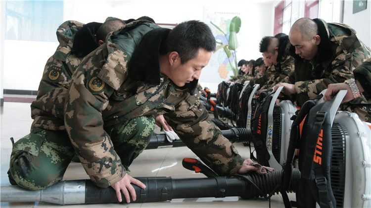 3月13日,為了更好地備戰春防,阿龍山林業局防火辦組織技術人員對風力滅火機等撲火器具進行全面檢修。(楊文鵬 攝)