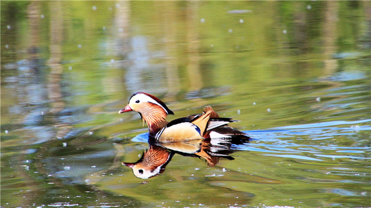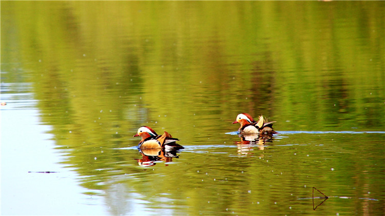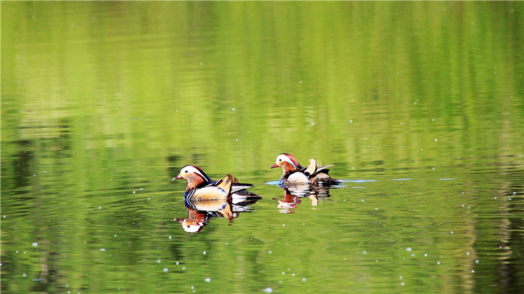 5月25日,內(nèi)蒙古大興安嶺滿歸林業(yè)局激流河公園迎來(lái)一對(duì)遠(yuǎn)方來(lái)客——兩只小鴛鴦。它們?cè)谇宄旱暮铀行斡安浑x,一起游動(dòng),十分可愛。(包旭民 攝)