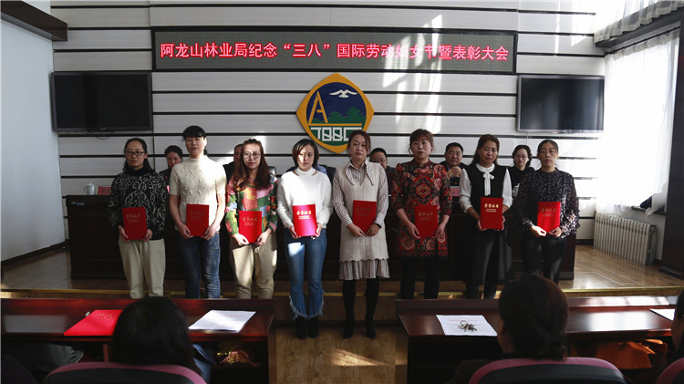 3月5日,內蒙古大興安嶺阿龍山林業局召開紀念"三八"婦女節109周年暨表彰大會,對在2018年度"提升女職工素質工程,建功十三五"勞動競賽,"培育文明家庭----女職工在行動"主題實踐活動中涌現出來的4個巾幗先進集體、26名巾幗先進個人,9名先進女工工作者、7個最美家庭、7名最美創業致富女能手進行了表彰獎勵。(張云峰 攝影)