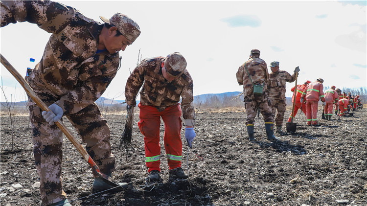 “五一”期間,內(nèi)蒙古大興安嶺庫都爾林業(yè)局搶抓春季頂漿造林有利時(shí)機(jī),在退耕還林地有序開展?fàn)I造沙棘林工作,株行距拉線定點(diǎn)、打泥漿、挖坑、栽植、踏實(shí)……各個(gè)環(huán)節(jié)有條不紊。管理局、林業(yè)局領(lǐng)導(dǎo)現(xiàn)場督導(dǎo),營林生產(chǎn)技術(shù)員跟班作業(yè),基層干部職工干勁十足,預(yù)計(jì)完成沙棘林營造任務(wù)1.5萬畝。圖為5月1日,位于巖山烏克里生態(tài)功能區(qū)的造林現(xiàn)場。(陳曉琳 攝)