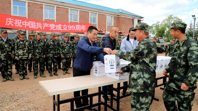 為慶祝中國共產黨成立99周年,6月24日,內蒙古大興安嶺庫都爾林業局黨委領導到防火辦慰問專業快速撲火隊員,感謝他們在撲救森林火災和保護生態資源中作出的貢獻,并為他們送去了黨組織的關懷和溫暖。圖為發放慰問品。(陳曉琳 郭春強 攝)