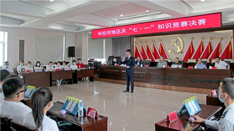 6月29日上午,在常態化疫情防控前提下,畢拉河地區慶“七一”知識競賽在畢拉河林業局五樓會議室如期舉辦,此次競賽由畢拉河林業局黨委主辦,特邀畢拉河國家級自然保護區管理局、森林公安局、畢拉河森林消防大隊等單位參賽,著力進一步推進林地黨建一體化建設,向中國共產黨成立99周年獻禮。 (孫琦夫 郭志虎 攝)