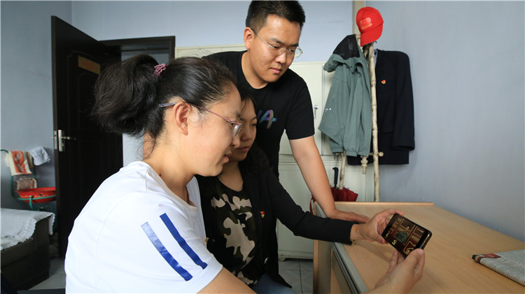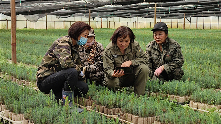 金河森工公司產業事業處苗圃女子育苗隊在大棚用手機觀看慶祝中國共產黨成立100周年大會直播盛況。